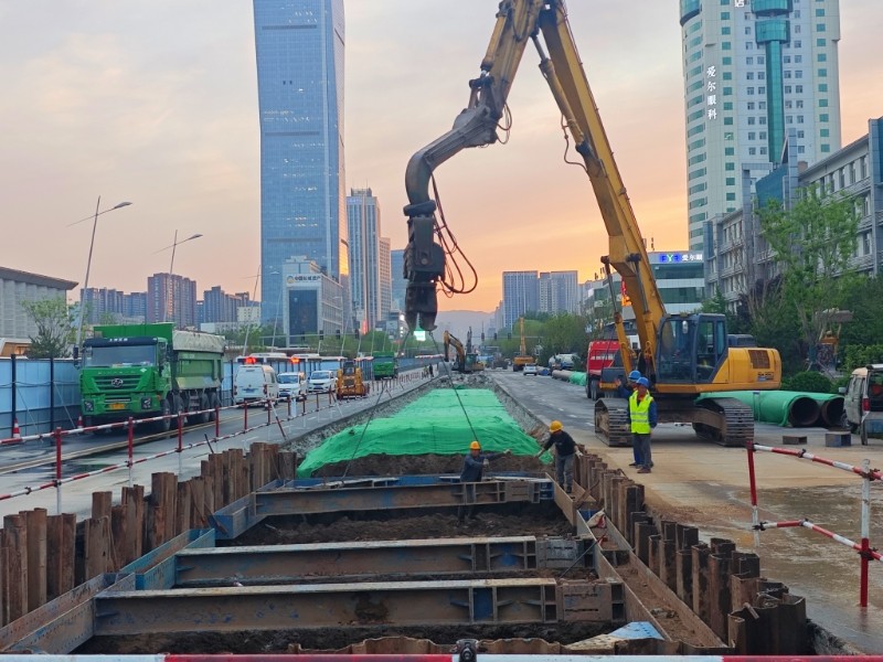 “追求精細極致,鑄就基坑支護的穩固防線”。項目部將鋼板樁施打質量視為確?;影踩c質量的關鍵環節,嚴格執行材料準入制度,所有進場鋼板樁均經過材質證明核查、尺寸精度測量和外觀質量檢驗三重把關,確保樁身無裂紋、無銹蝕等質量缺陷,從源頭上杜絕不合格材料。施工中,施工人員采用全站儀進行動態監測,嚴格控制樁身垂直度偏差在規定范圍內,詳細記錄每根樁的打入深度、貫入度等關鍵參數。拔樁階段采用專用施工設備,按照“先支后拆、分段拔除”的原則有序進行,拔樁后出現的孔隙立即灌砂,最大限度減少對周邊土體的擾動,實現平穩施工與環境保護的和諧統一。