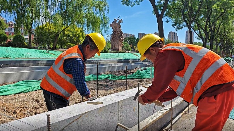 “以工匠精神,打造城市街道的靚麗名片”。項目部對所有進場花崗巖板材進行逐塊檢驗,確保板材表面平整度、缺陷指標符合設計要求,讓石材自帶“高顏值”。施工中,施工人員嚴格控制混凝土基層表面平整度偏差,確保壓實度達到95%以上;鋪貼階段采用“試鋪—校正—精鋪”的工藝流程,嚴格按配比配制干硬性水泥砂漿;鋪貼時使用橡皮錘從板材中心向四周均勻輕擊,確保砂漿飽滿密實,相鄰板材高差控制在正負1毫米以內,接縫寬度保持均勻一致。鋪裝完成后利用專用填縫劑進行嵌縫處理,并實施保濕養護,確保鋪裝層達到平整美觀、堅固耐用的質量要求。